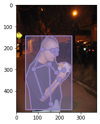 아래 출력에서 알 수 있듯이, Annotation에는 segmentation정보와 Pose estimation에 사용되는 keypoints, Object detection에 사용되는 bbox 등 정보를 확인 할 수 있습니다.